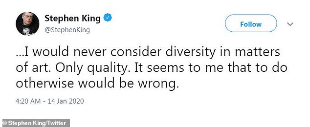 King’s Tweet, if you haven’t read it said …I would never consider diversity in matters of art. Only quality. It seems to me that to do otherwise would be wrong.