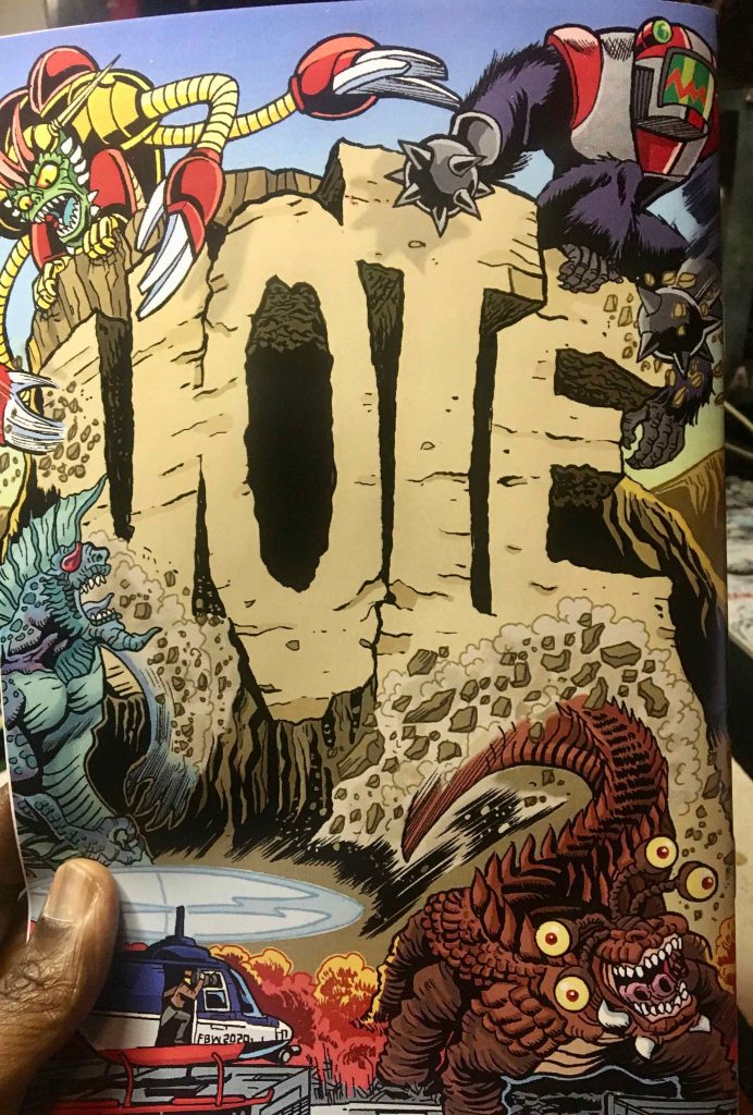 Four LIMITED EDITION: Roughly 3.75″ x 4.75″ Godzilla Monster Truck Patches : Velcro Backing + Title Card Art (There’s some wear on the plastic sleeve because of storage. No damage to the Patch or Title Card). Frankie has drawn a rough sketch of Godzilla 2014 and signed the Title Card.