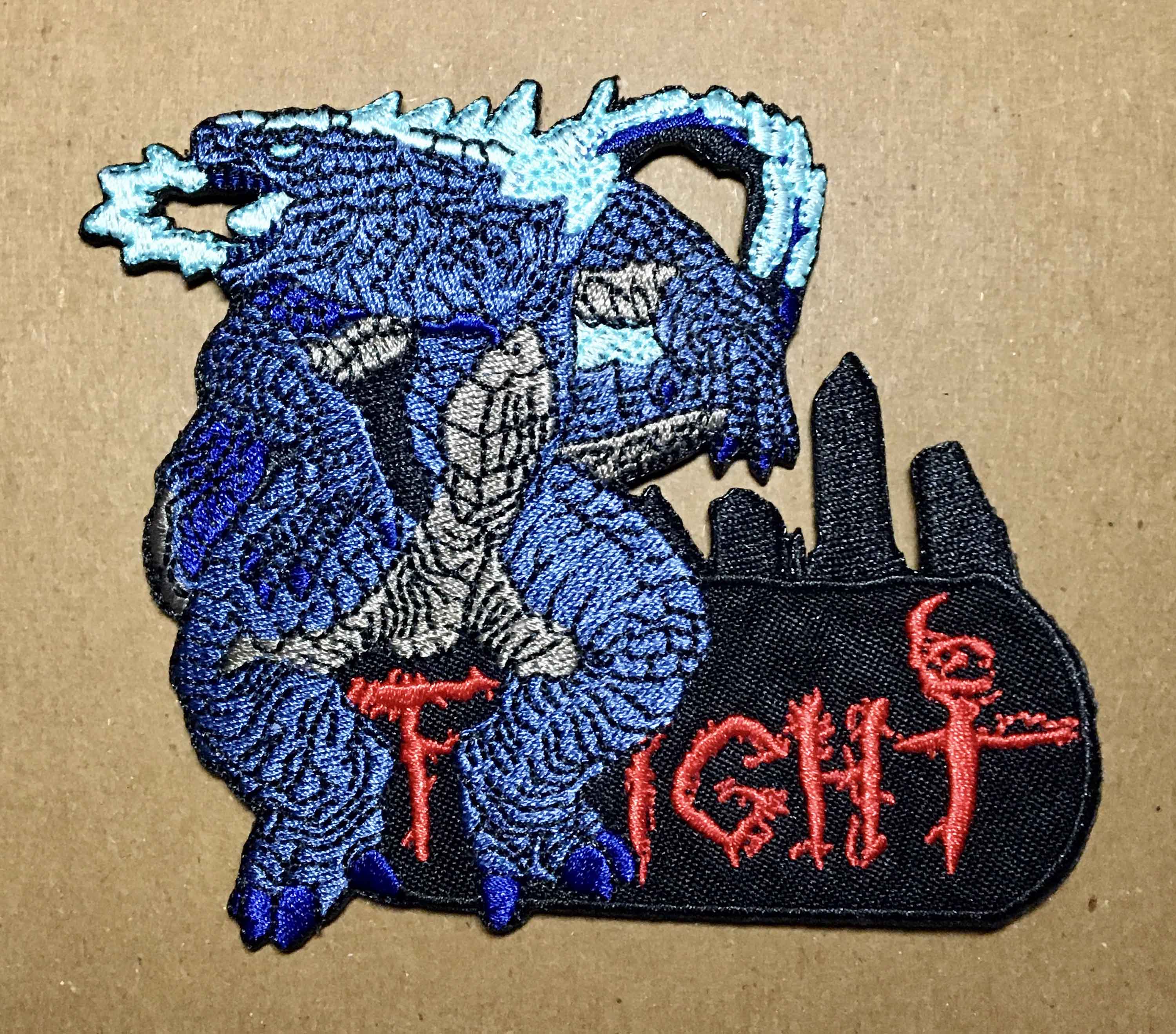 Fourteen roughly 3.25″ x 4″ Godzilla FIGHT Patches : Velcro Backing. No Title Card Art (Stored in a plastic sleeve).